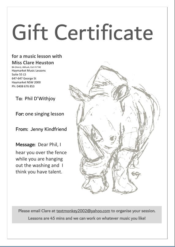 Shop › Here's a sample to start you thinking... Image 1 of 1 Here's a sample to start you thinking... from A$60.00 Contact Clare to discuss your custom printable gift of anything from one 45 minute session to a term’s lessons! Value: Select Value A$60.00 A$120.00 Purchase Added! Contact Clare to discuss your custom printable gift of anything from one 45 minute session to a term’s lessons!